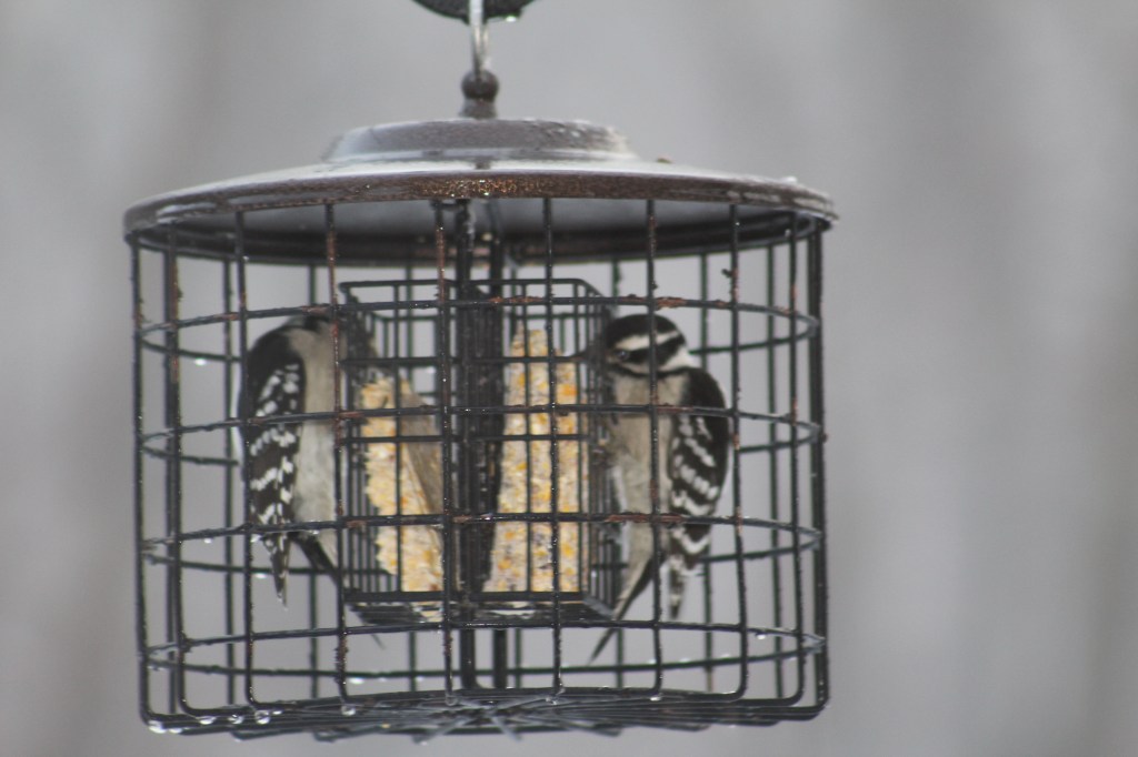 Both these woodpeckers live in our area year-round. They like wooded areas, especially one like my backyard with lots of dead trees since the tornado back in 2011. If you have bird feeders out, you likely see these birds as they visit my feeders many times a day. They will eat my nuts and suet. I had one Downy that would peck on my window whenever the nut dish was empty-so cute and friendly. In the wild, they will peck at the trees to find beetle larvae, ants, termites and other insects inside them. They also eat wild berries, acorns and seeds. Fun fact, if you see a woodpecker pecking at a certain area of your house consistently, get it checked out for termites!
