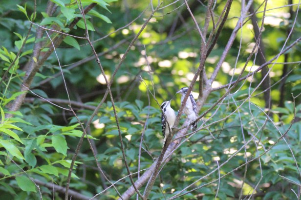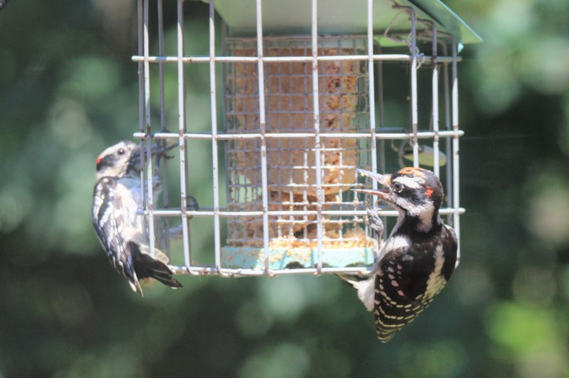 They nest in dead tree cavities as well, usually ones with fungus as they are easier to bore into. Both species will use wing displays to attract a mate. Downeys are monogamous and the pair will work together to build a nest area in a couple of weeks. They create an entrance hole and then line the cavity with wood chips. The female will lay 1 brood of 4-6 plain white eggs usually. Hairy Woodpeckers do not remain together year-round, but often hitch up again in the spring to nest in the female’s territory. To find a new mate, they serenade each other with pecking patterns! The Hairy will lay 3-6 white eggs with a few black spots. Both species breed between April and June. Both adults work together to incubate the eggs and feed their young. I have raised quite a few families in my yard.