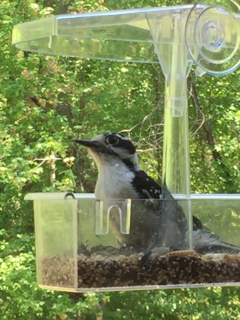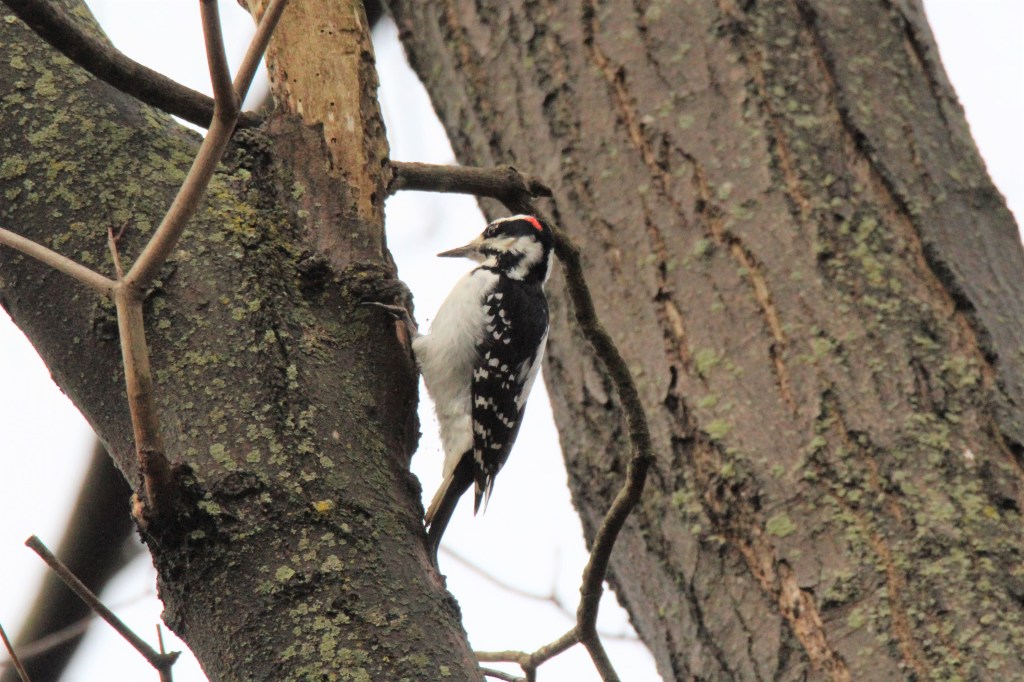 I often use behaviors and sound to identify birds, especially if they are difficult to see. All woodpeckers fly in an up-down bounce-like pattern so this can be a clue. I do see other birds like Chickadees and Titmice do this also though. Woodpeckers will often be perching with their head back or scaling trees. I think their different sounds are really the best way to identify them. They make different sounds. As for chirps, a Downy sounds like a lot of other birds to me-a short, quiet chirping. The Hairy has a loud, sharp distinctive chirp you can hear below. All 3 birds have a woodpecker trilling sound. The Downy’s is prettiest to me-sweet and smooth sounding. Both the Hairy and Yellow-bellied have sharper, less melodious trills. The Sapsucker makes a very distinctive whining sound. I do not have this sound recorded but will try to get one. You can distinguish these 3 woodpeckers from their pecking sounds too. The Yellow-bellied sounds like he is pecking on metal-a tinnier, hallow sound. The Hairy and Downy sound similar but have different “drumming” patterns. The Hairy pecks like 25 times-fast and furious and then takes a 20 second break. The Downy pecks around 15 times, more slowly and has shorter pauses between sets.