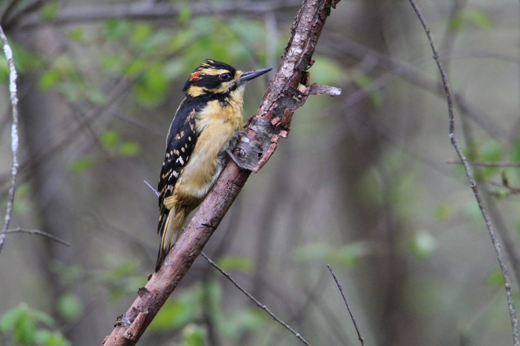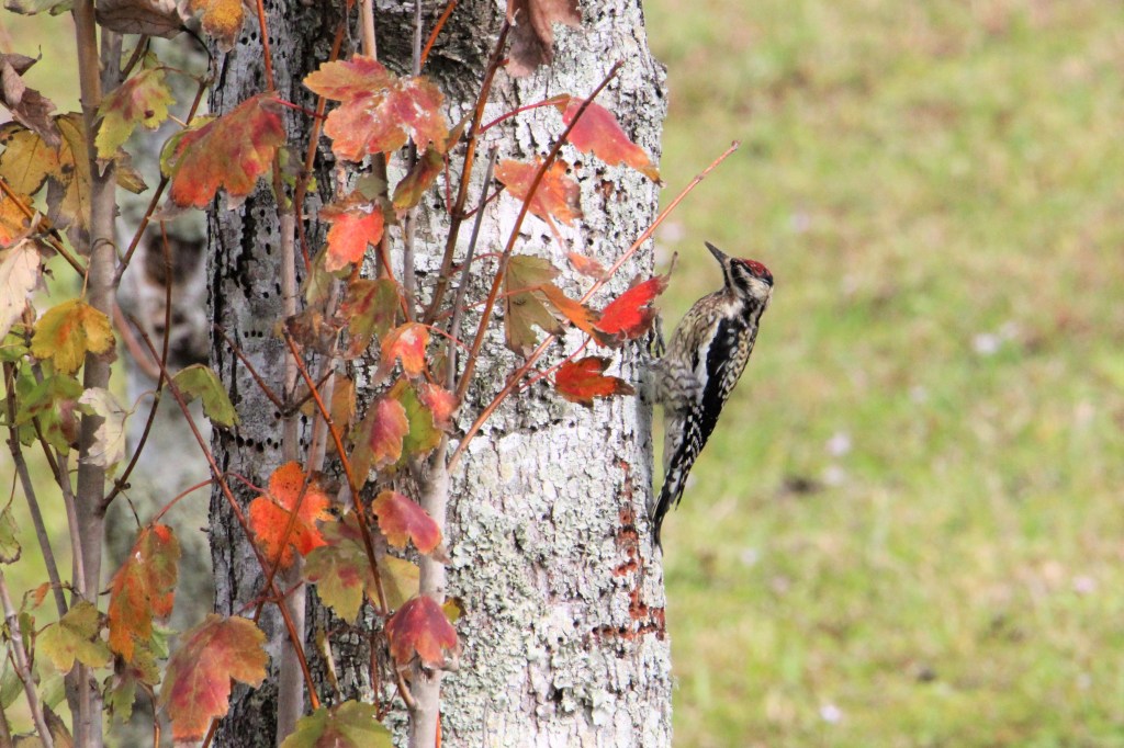 The Yellow-bellied Sapsucker is similar looking from a distance, especially the juveniles who lack the colors of the adults. They also have black and white feather patterns, but they lack the large plain white areas. The adults have yellow tinged areas with a thin white strip on the sides. The female has a red patch on top of her head and the male Yellow-bellied Sapsuckers are striking with a large red patches on their heads and throats. They are also found in in forests and wooded areas but are not frequent visitors to backyard feeders. They are migrants and uncommon in the winter in our area. They like to eat the sap and insects from the sap wells of Aspen, Birch, Maple, and Elm trees. They have the same nesting behaviors as the other woodpeckers and will also lay 4-6 white eggs.