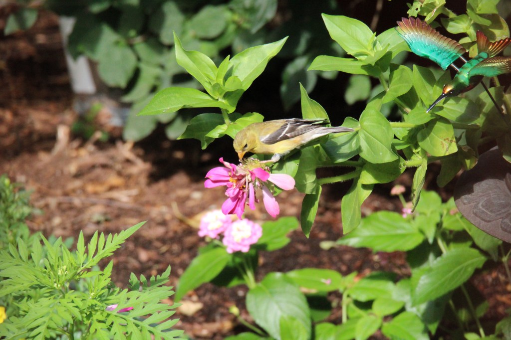 Now, what does my bird look like? Size and shape help you to narrow down your options. Ruby and Golden-crowned Kinglets are tiny little birds compared to the small warblers, medium-sized finches, and larger female Baltimore Orioles or Scarlet Tanagers. Kinglets look like little, round puffballs, while vireos and goldfinches are longer and thinner-looking. By now, birds are done molting, so they are wearing their beautiful spring colors, especially the breeding males. I use these colors and feather patterns as well as beak size and shape to single in on a bird family, such as the finches. For example, goldfinches have a larger, orange, conical, beak used to crack seeds and black wings with 2 white wing bars. Warblers will have smaller, tweezer-shaped bills to dig insects out of crevices and different colored wings with muted wing bars. Compare the songbirds below to see some of these differences.