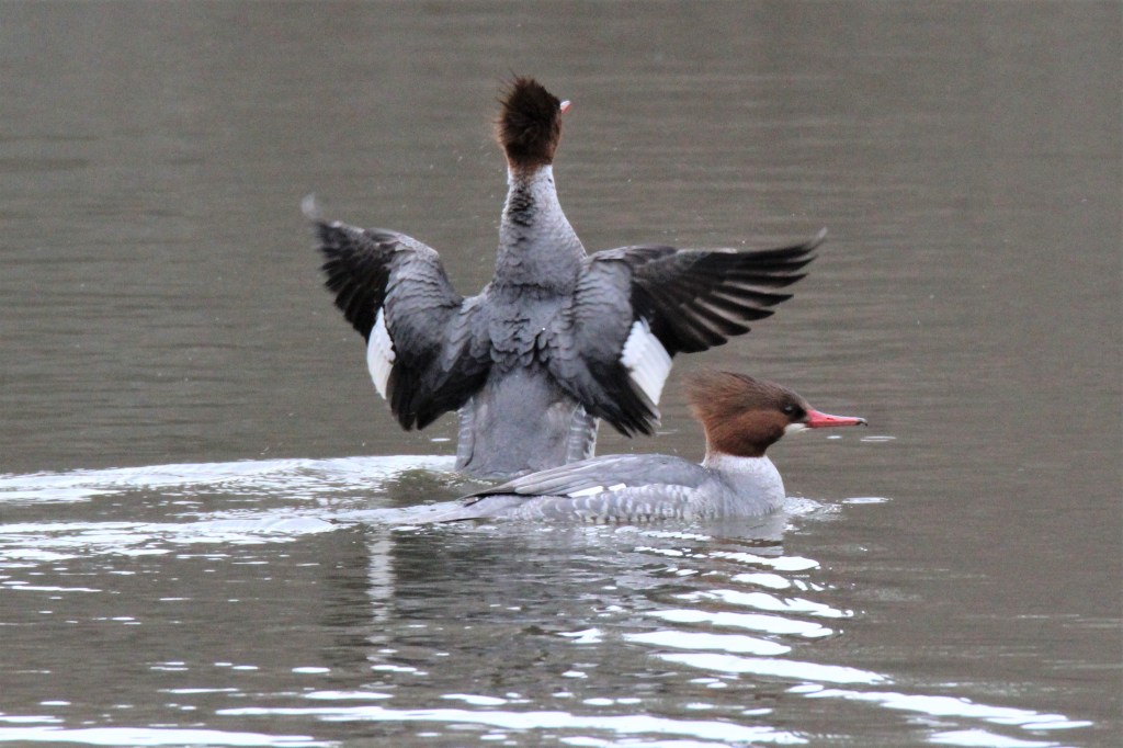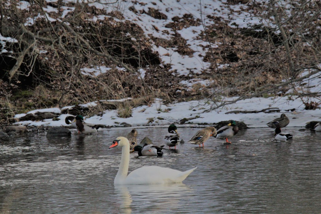 Recently, I have seen 2 Bald Eagles at once (a dream come true), a Great Blue Heron that clearly winters here, some Hooded and Common Mergansers and a Red-tailed Hawk. Every visit, I have also seen a very cute black and white duck (see video) that some people say is a Domestic Mallard and others think is a Magpie Duck. I am not sure, but he or she loves to eat the duck food I bring. I cannot wait to see what birds visit the park in the spring!
