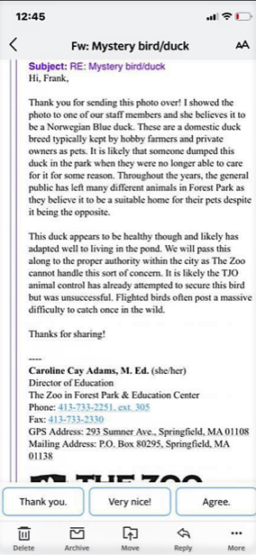 This is an update on the very cute black and white mystery duck at Forest Park. He, or she, was still there last week when I went. To my new Facebook Friend-Denise Leonard-Thank you for reaching out to the park and sharing this info with us all!